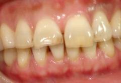 內(nèi)面為鎳鉻合金內(nèi)冠,外面為烤瓷。美觀性較好,但有患者對鎳過敏,有的會出現(xiàn)牙頸部灰線或變灰暗。