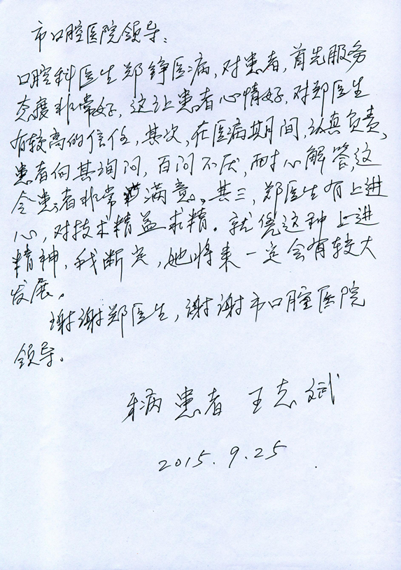 口腔內(nèi)科為衛(wèi)生計生委最佳形象科室,是我院重點學(xué)科之一,口腔內(nèi)科的全體醫(yī)護(hù)人員一直以來用她們精湛的醫(yī)術(shù),和藹的態(tài)度及全心全意為廣大人民群眾服務(wù)的精神得到了廣大患者的一致認(rèn)可及好評,并經(jīng)常收到患者的表揚信。近日,口腔內(nèi)科的鄭錚醫(yī)生又收到患者表揚信一封:患者王某某于9月25日就診,信中對診治醫(yī)生鄭良好的服務(wù)態(tài)度,百問不厭、對患者認(rèn)真負(fù)責(zé)的精神,精湛的醫(yī)術(shù)都給予了很高的評價。希望我院全體醫(yī)生特別是年輕醫(yī)師,要向鄭錚醫(yī)生一樣,努力工作,共同進(jìn)步,為我院美好的未來添磚加瓦。